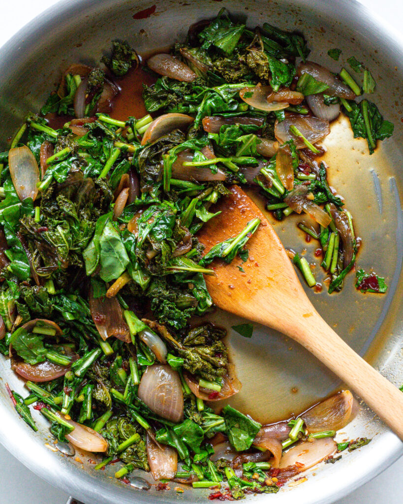 Shallots take some time and some oil to get really nice and jammy, it’s one of my favorite things. So add the olive oil to a large sauté pan and set it on medium heat. Let the oil come to temperature and then add the shallots. Cook for 4-5 minutes or until their layers start to break apart and they become jammy. Season with salt. Add the garlic and calabrian chili paste (or chili flakes) and cook for another 2-3 minutes.
