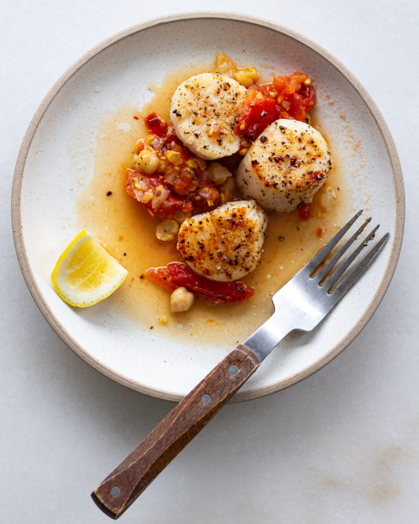 - To plate, spread the roasted tomato chickpeas in a thin layer on a large plate. Dot with scallops. Add cracked black pepper and lemon wedges to serve!