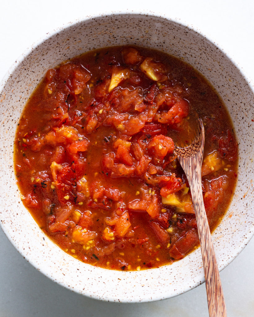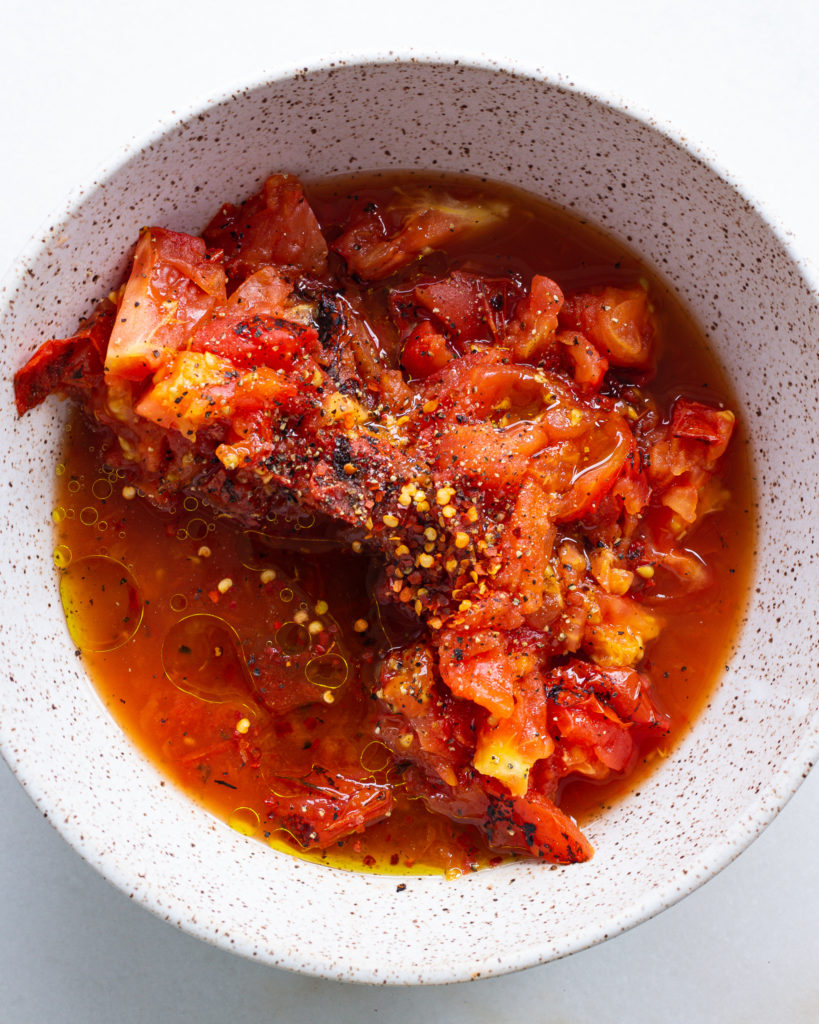 - When the whole tomatoes are cool enough to handle, transfer them to a board and coarsely chop. Transfer the tomatoes with their juices to a medium bowl. Add the red wine vinegar, red chili flakes, and the salt and pepper. Add a generous glug of olive oil and stir. Taste and adjust the vinegar, salt, pepper and olive oil as needed.