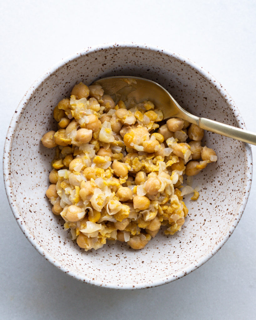 - Add the chickpeas and stir to coat them in the cooking liquid. Season with salt and lightly smash about half of the chickpeas, making a thick but chunky consistency.