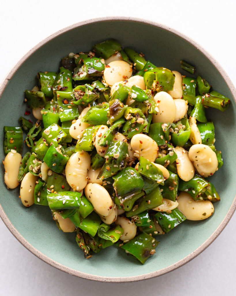 This shishito-bean salad is relatively easy (that’s the whole point!) Just start by cooking the peppers in batches. Blister the shishito peppers. Set a pan over medium heat and add a tablespoon of olive oil. Cook the peppers undisturbed for 4-5 minutes, or until they form char marks, agitate the pan and cook again until all sides are blistered. Transfer to a cutting board.