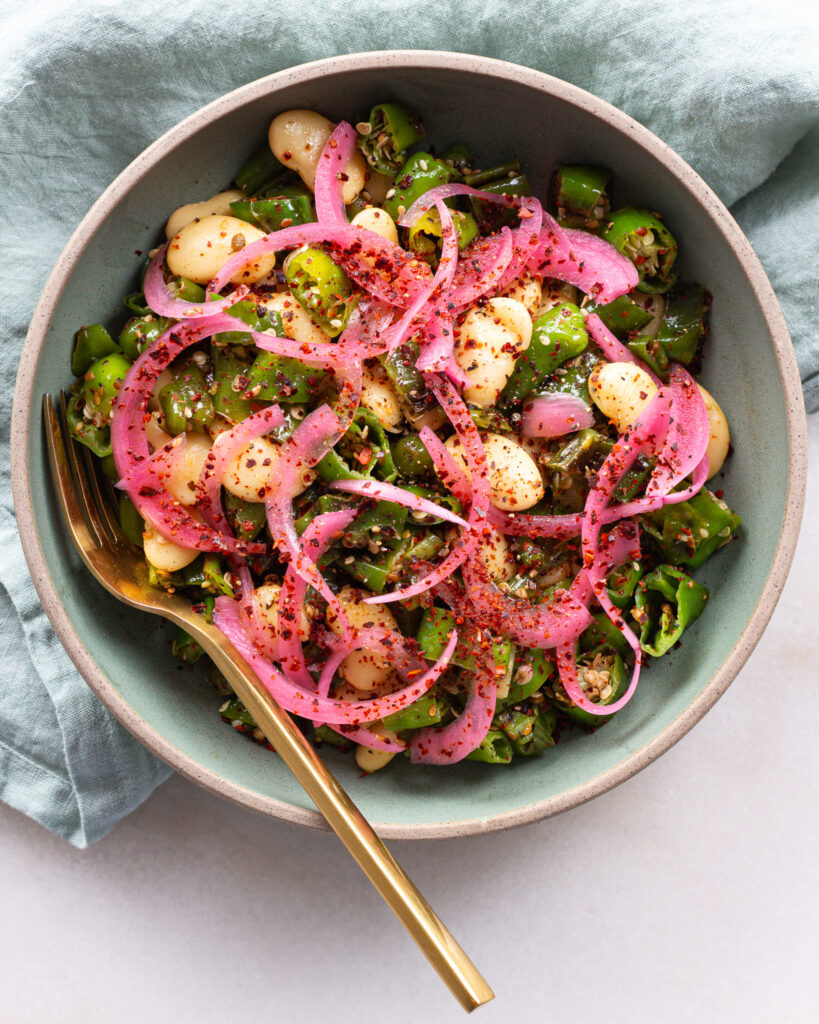 This is my favorite quick and easy dinner if you are looking for something filled with protein, truly nourishing, and packed with flavor. It’s plant-based, easy to make, and surprisingly filling – most likely thanks to the olive oil and butter beans. (Ahem – mediterranean diet who??) But, of course, amid all its flavors, I couldn’t skip the pickled red onion. This salad has plenty of *zing* to it, but the punch of sweet, salty and briny flavor the onions give is simply irreplaceable.