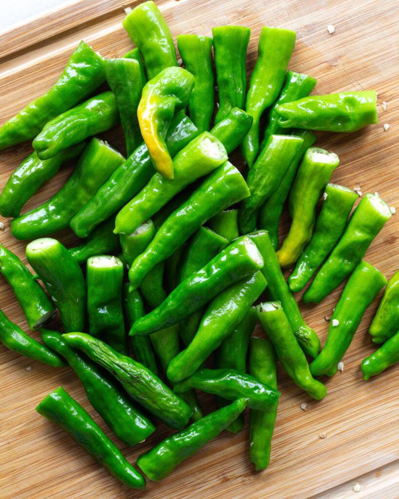 Shishito peppers are a mild pepper, and you will usually find them green, although sometimes they can be red, or a mixture of both. The peppers start red, but as they ripen, that’s how you get to their signature green color. I find them in most grocery stores, but if you’re stumped, you can usually find them at Asian specialty grocers as well!