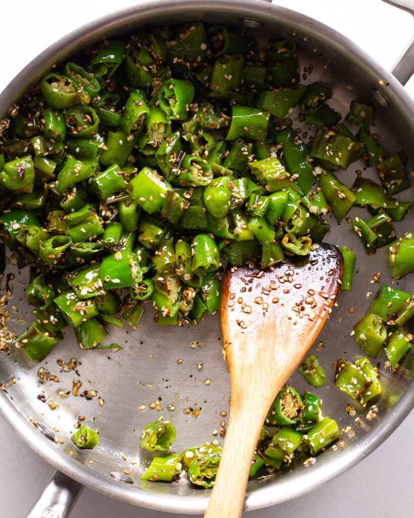 - In two batches, blister the shishito peppers. Set a pan over medium heat and add a tablespoon of olive oil. Cook the peppers undisturbed for 4-5 minutes, or until they form char marks, agitate the pan and cook again until all sides are blistered. Transfer to a cutting board.