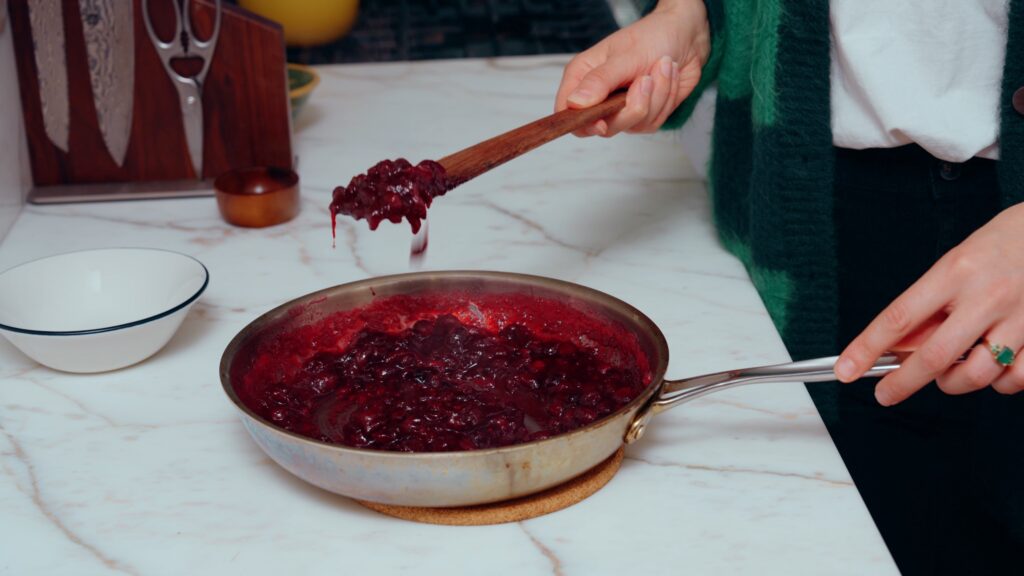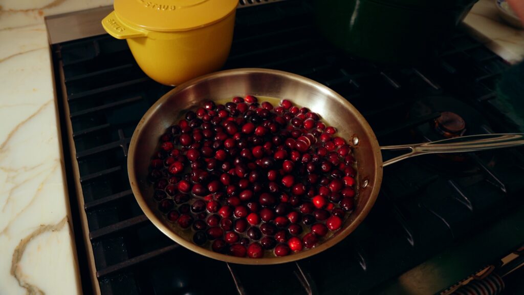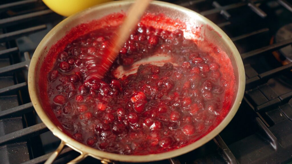 - Place the pan over medium-low heat and add the cranberries. Stirring occasionally, allow this mixture to come to a low simmer. The cranberries will begin to pop and break down at this point, so be careful!