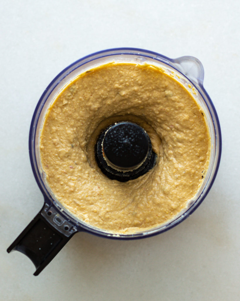 - Make sure all the skins of the chickpeas are removed, and add to a food processor.