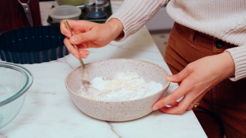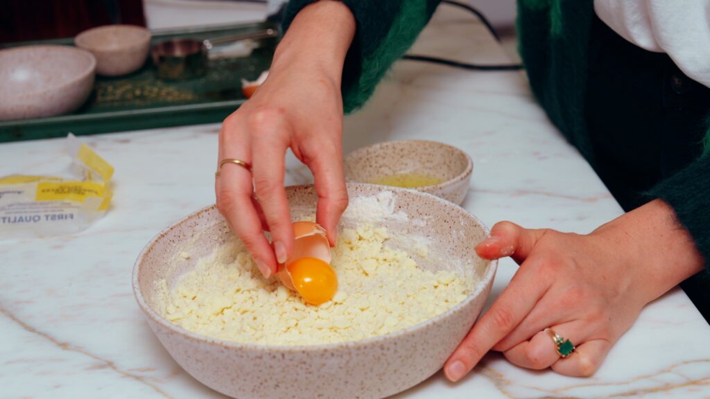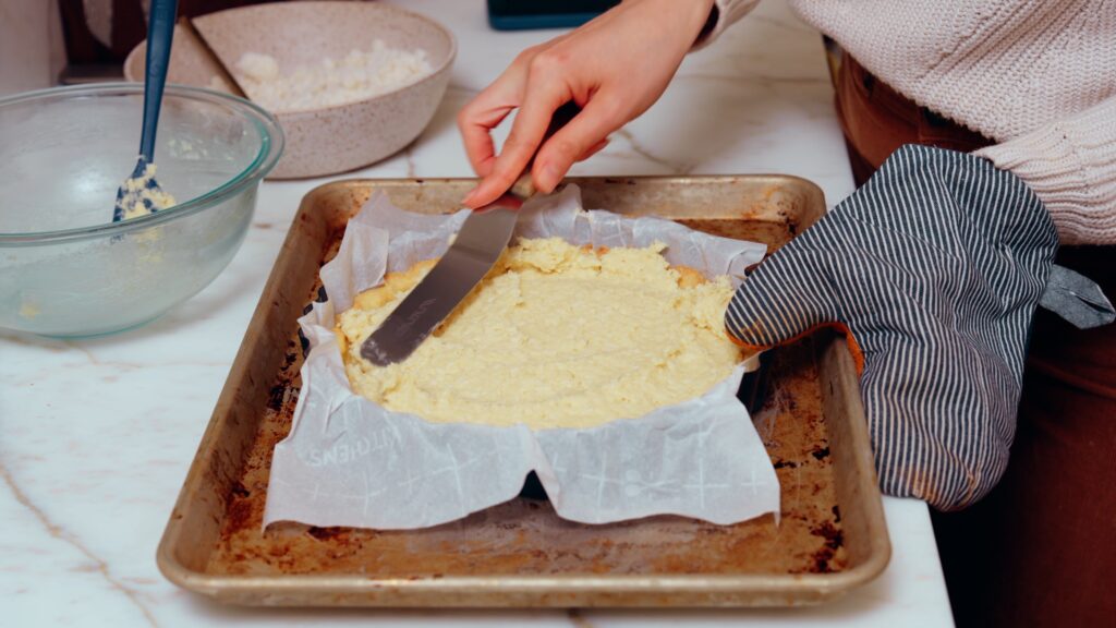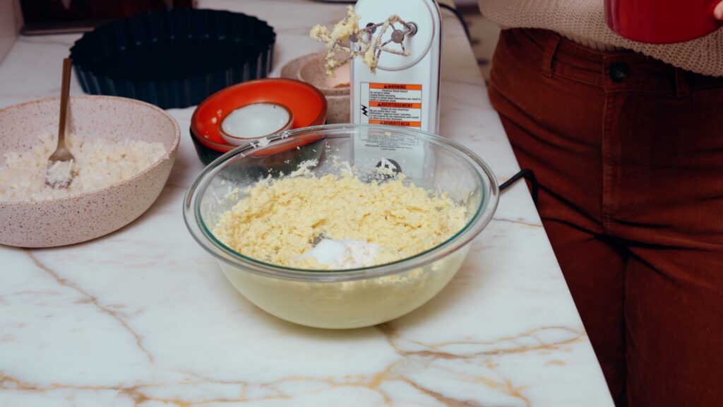 - For the crust, use a hand mixer to mix together 113 grams softened salted butter, 50 grams granulated sugar and 15 grams of shredded coconut. Mix until fluffy, then add 140 grams of flour and 1/2 teaspoon salt. Mix in the flour and salt until shaggy, then add the egg yolk and mix until a tacky dough forms (this may take a few minutes, but it will get to a play-doh like texture after a bit).