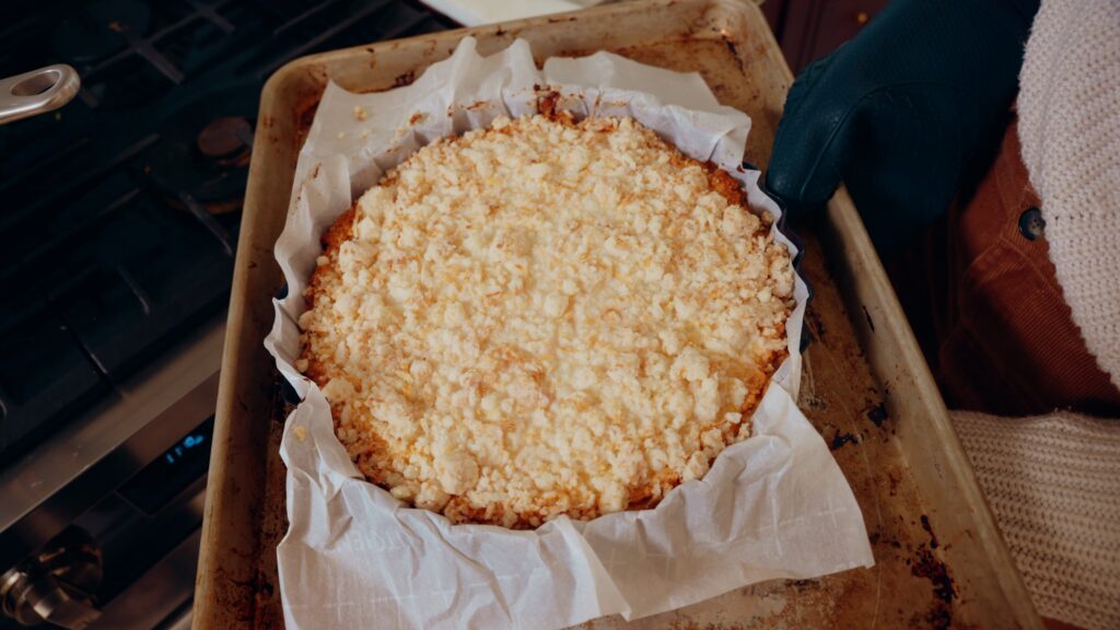 - To the par-baked crust, add the coconut filing and spread it to the edges, then scatter the crumble on top.