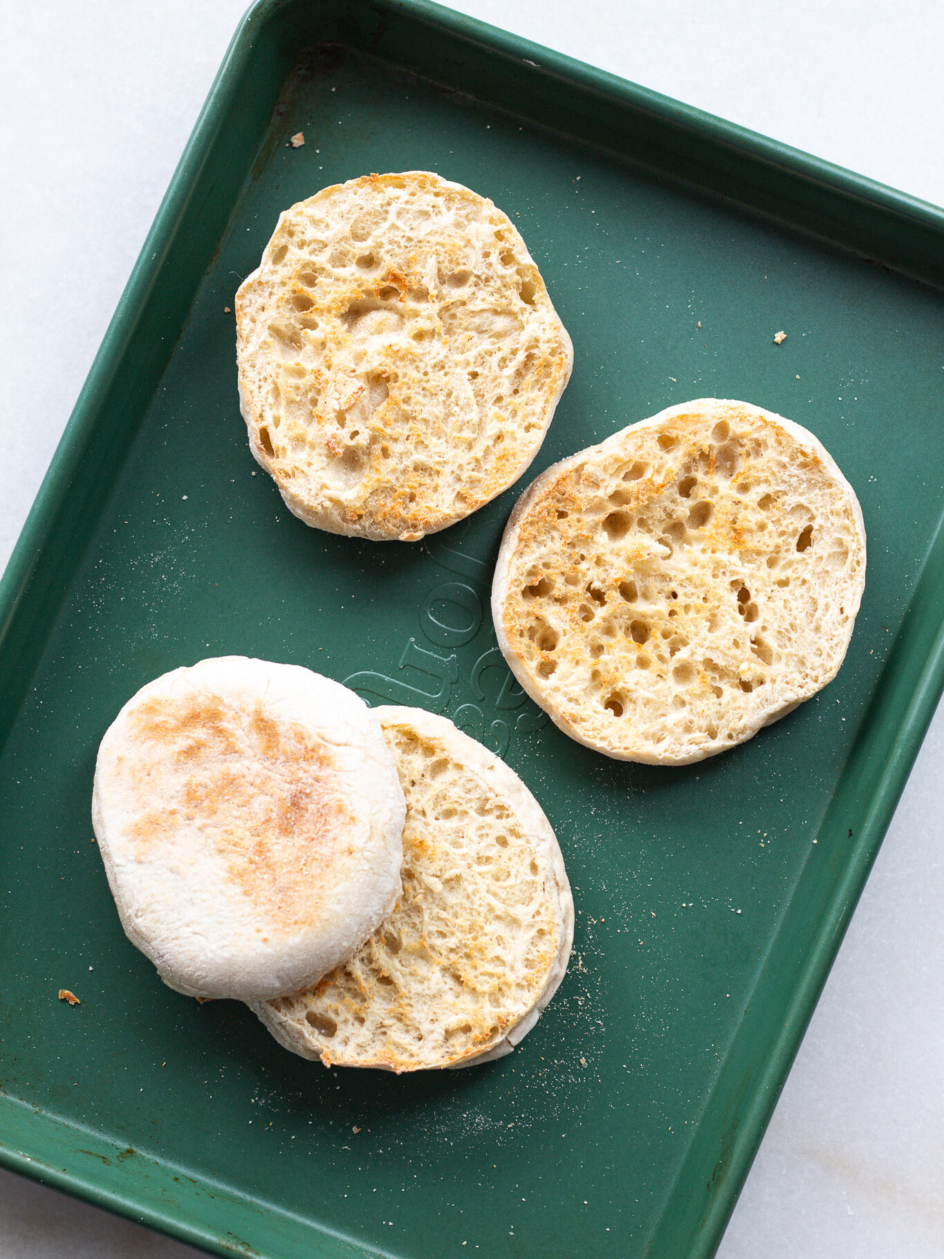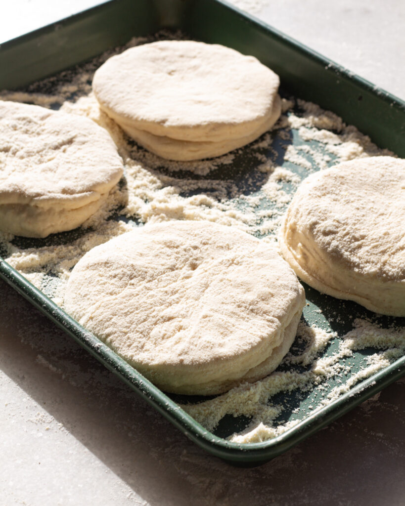 - Lightly dust a half sheet pan with white cornmeal, transfer the muffins to the sheet pan and flip them so that each side is coated well with cornmeal.