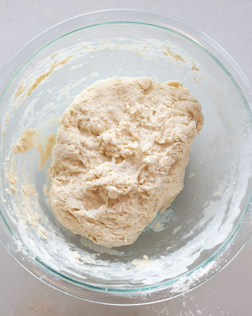 Move the dough to a lightly floured surface, gently pull it into a rectangle and press down until it is 1-inch tall. Use a round cutter to slice into 8 even circles, each about 4 inches in diameter. Press together and re-roll out any remaining dough as needed to get 8 circles.