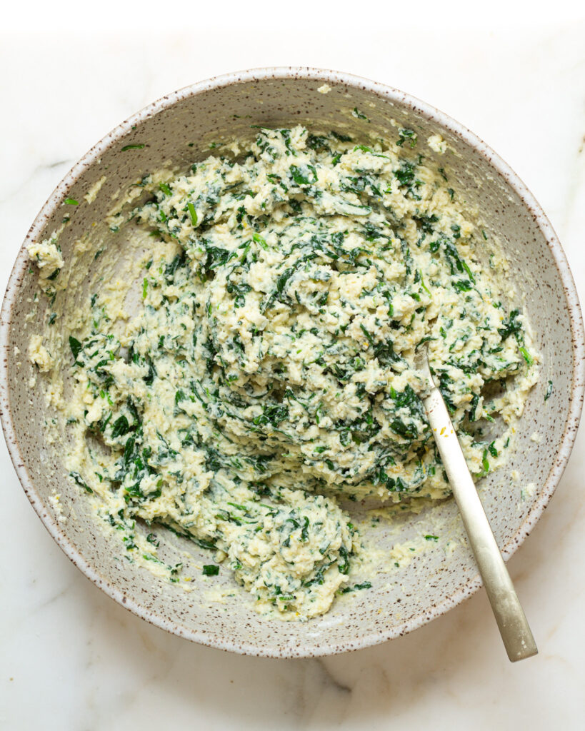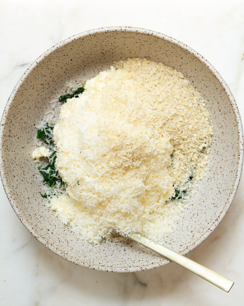 - Add the spinach and ricotta to a large mixing bowl. Crack in the egg, add in 1/2 cup parmesan, 1/3 cup bread crumbs, 1/2 teaspoon lemon zest, 1/4 teaspoon freshly grated nutmeg, 1 teaspoon Diamond Crystal kosher salt, and mix.