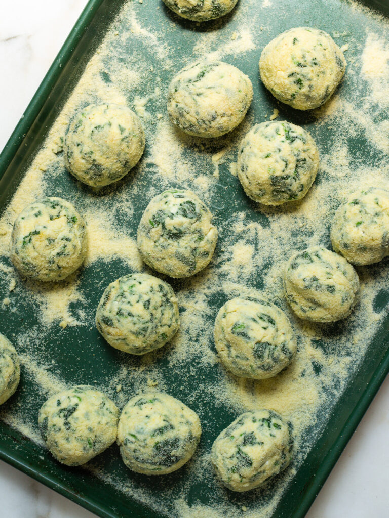Once they are all scooped out, I then dust them with a bit more semolina flour and roll them into balls with my hands. Doing this on a baking sheet prevents any mess, and then they are already where you’ll want to store them!