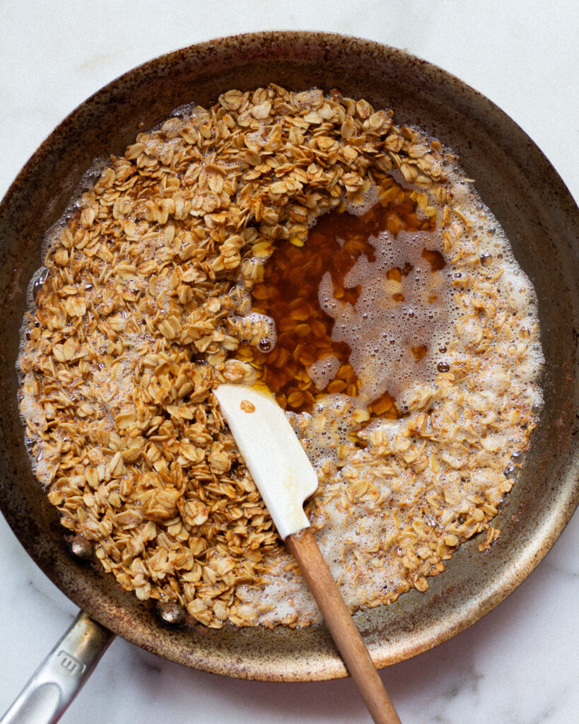 During this time the oats will have absorbed some of the butter, so they will look more toasted and darker in color. That’s what you want!