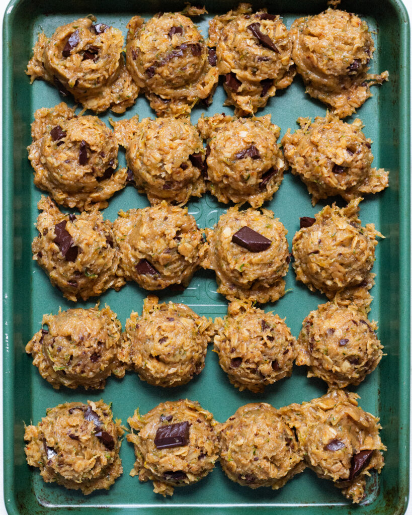 These were delicious! The nuttiness of the brown butter/toasted oats complements the zucchini and dark chocolate really well. I substituted gluten free flour, but they still spread out and caramelized nicely while baking.