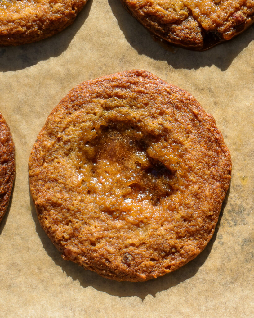 When I was looking to make a date-infused cookie dough, it was a struggle to figure out how to do that while also making sure the cookies weren’t too puffy or cakey. If you know anything about me, you know I love a cookie that is soft at the center, but nice and crisp at the edges, all while being uniformly flat throughout. But when you add in any paste (in this case, date paste), things are about to get…puffy. So this cookie took some tests! To get them perfectly flat with an insanely chewy texture, I used egg whites instead of eggs and a bit more water for maximum spread. The dough holds up a perfectly golden toffee, which makes everything feel very reminiscent of the classic English dessert, while still being a distinct cookie.