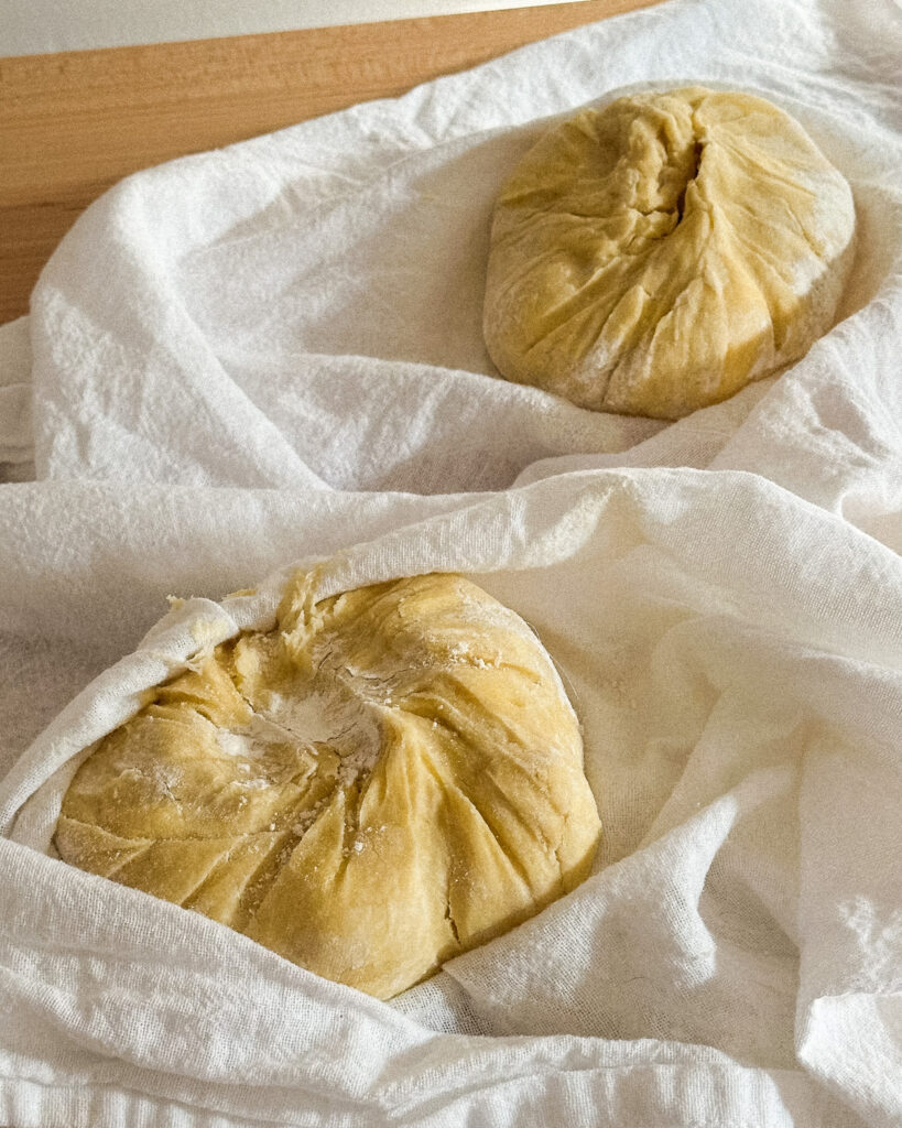 - Move the pie dough to a lint-free tea towel and use the towel to press the ball together into a tight dough. Transfer this to the fridge for at least an hour, but it can hang out for up to a day. This also freezes well.