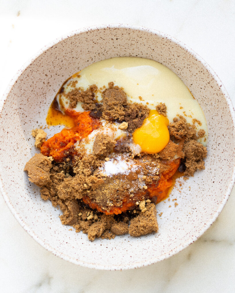 - While the crust is baking, prepare the pumpkin filling. Whisk together the 82 grams of brown sugar, 212 grams of pumpkin purée, 170 grams of sweetened condensed milk, 1 large egg yolk, 1/2 teaspoon pumpkin pie spice and 1/2 teaspoon salt.