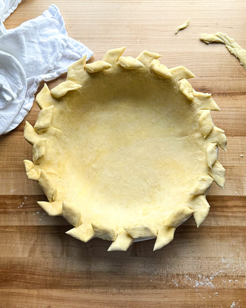 There are many ways to shape a pie crust, but here I like to either do a traditional pinched pie crust, or the above version, where you take scissors and cut at an angle all along the crust, then fold the pieces to the opposite side.