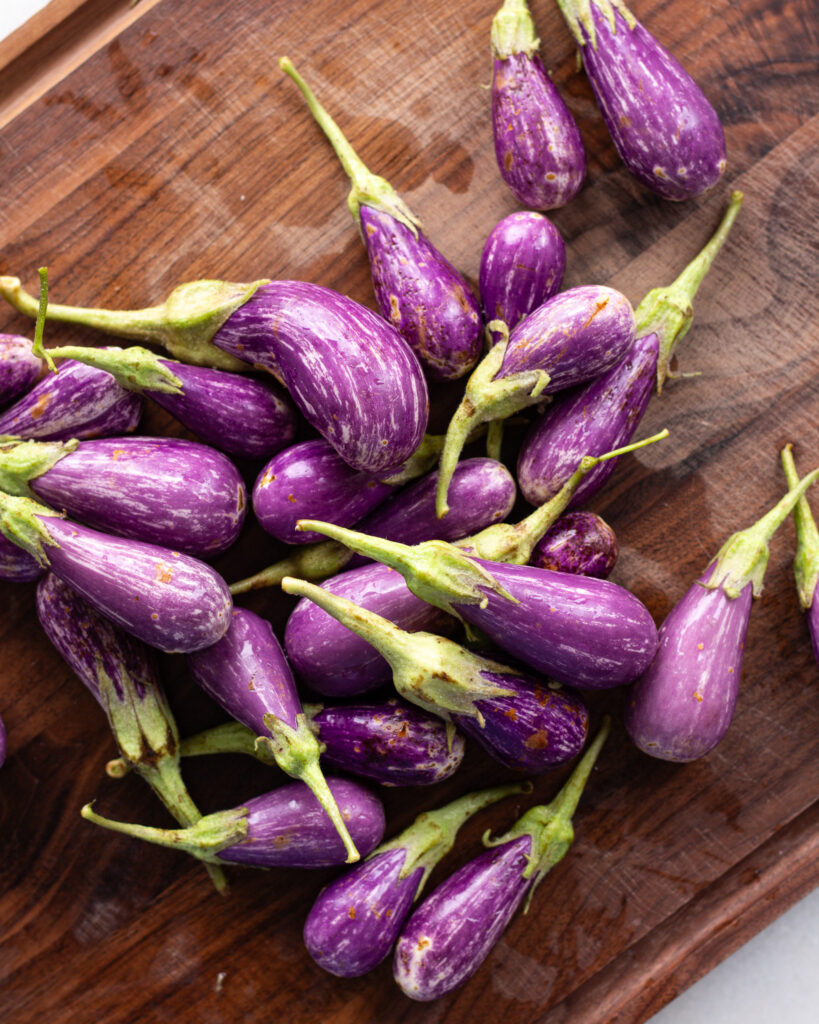 Fairytale eggplant is one of my favorite eggplant varieties. It eats just like eggplant, but is much smaller in size. Unlike Japanese eggplant (which are also smaller than Italian eggplant) fairytale eggplant tend to be firmer and a bit meatier in texture. They show up during the early summer months (farmers rejoice!) and are very fun for throwing on the grill or sautéing in a simple recipe like this. I love fairytale eggplant because they cook quickly and hold together. If you are new to liking/eating eggplant, fairytale eggplant are a great place to start.