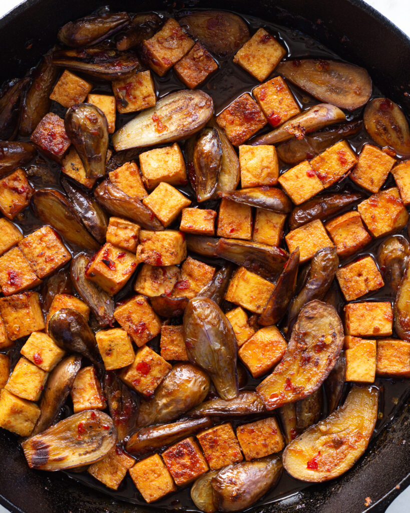 Before you add the sauce to reduce in this recipe, you’ll need to sear both the tofu and the eggplant. My big tip with any tofu recipe is that the tofu will release when it’s ready. If your tofu is still sticking to the pan (and that pan is oiled and heated), then the tofu is not ready to flip yet.