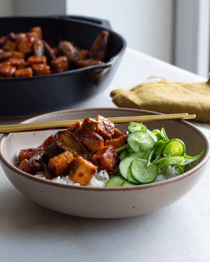 For this recipe you do need to press the tofu, but there’s nothing too dramatic after that. Everything is done in one pan, and then you serve it with steamed rice and a quick salad. The result is a really well-balanced meal that is inspired by both Japanese and Indonesian culture, and I hope you’ll want to make it on repeat!