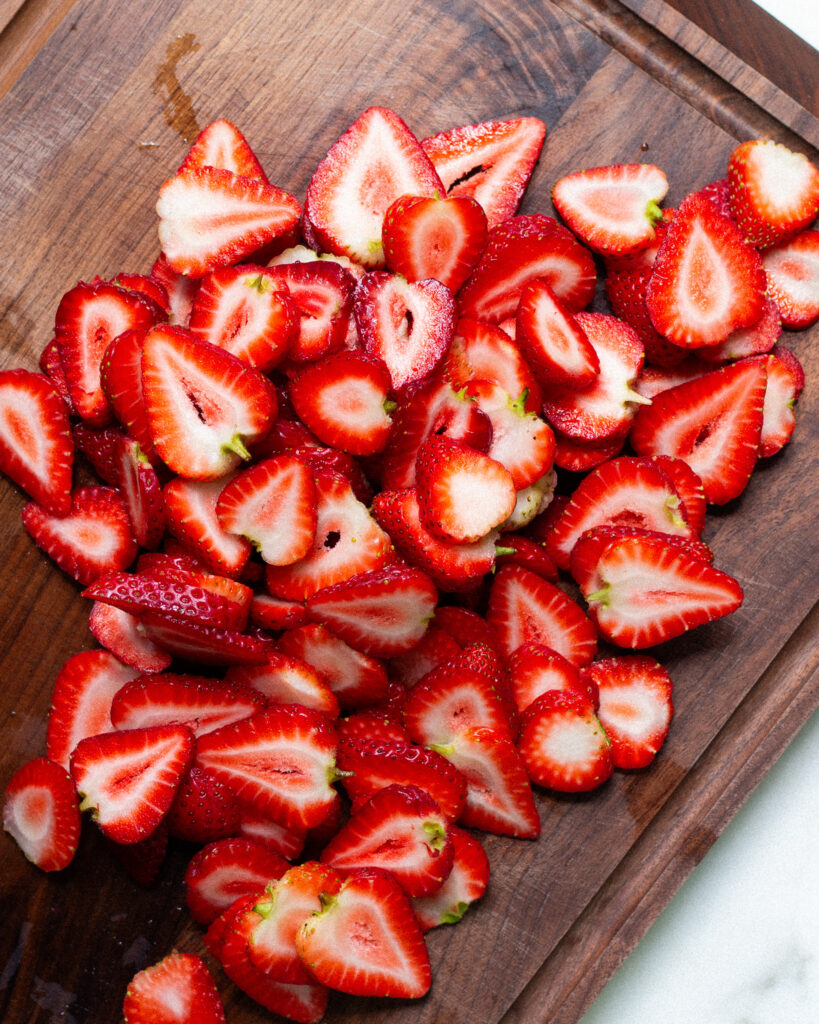 - Slice the strawberries and add them to a large bowl. Add in 1/4 cup of the citrus sugar and mix. Reserve the rest of the citrus sugar for the shortcakes.