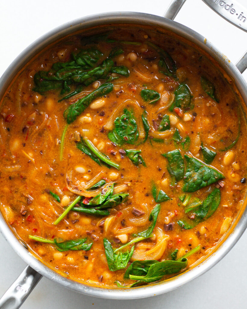 - Lastly, toss in the spinach and give it a stir. It will wilt into the beans in seconds.