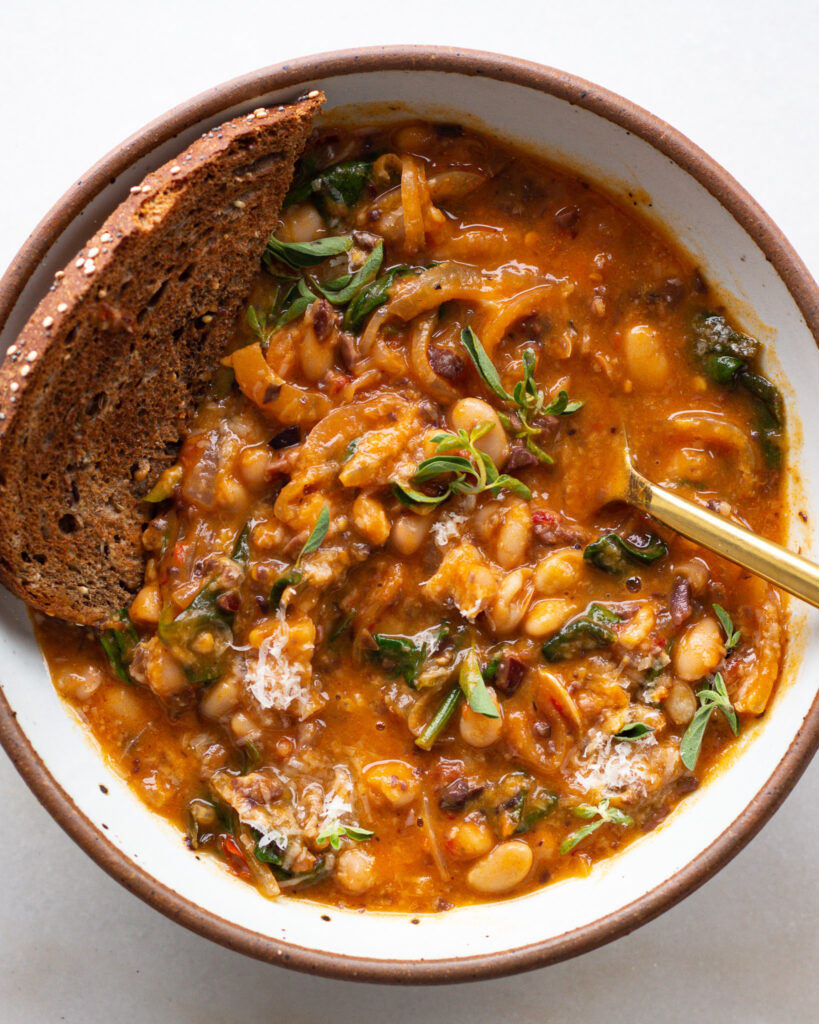 These spicy and sweet potato beans are my current brothy bean fixation, and that’s saying something, because I have a lot of brothy bean fixations. But these are just so unique and so good. They are incredibly easy to make, and using canned beans means you can whip these up in no time. The sweetness from an easy sweet potato “broth” (see the blog post below for more details) plays so perfectly with the spiciness of the chili in the beans, and the salty hit from the kalamata olives. If you’re an olive person, or a spice person, or even just a bean queen, these simple sweet potato beans have something going on for you.