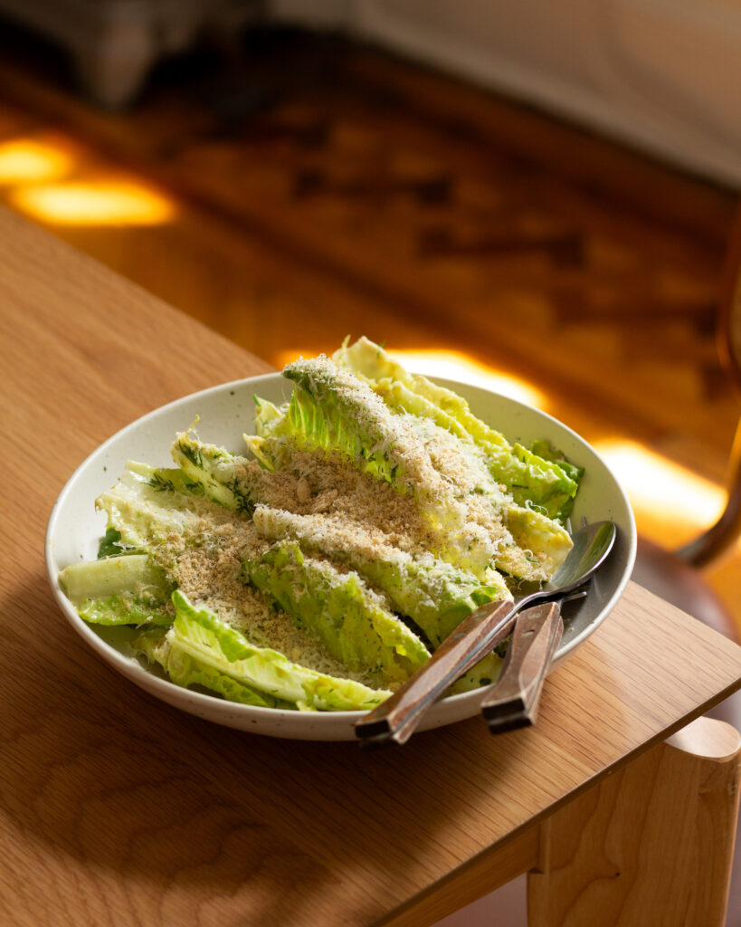Made this two nights in a row! I’m vegan, so I did a tsp of capers and brine (mashed with the back of a fork) and a heaping tsp of white miso instead of anchovies. It really is worth it to make sure it’s fully emulsified! And I am so pro dill and breadcrumbs on this salad.