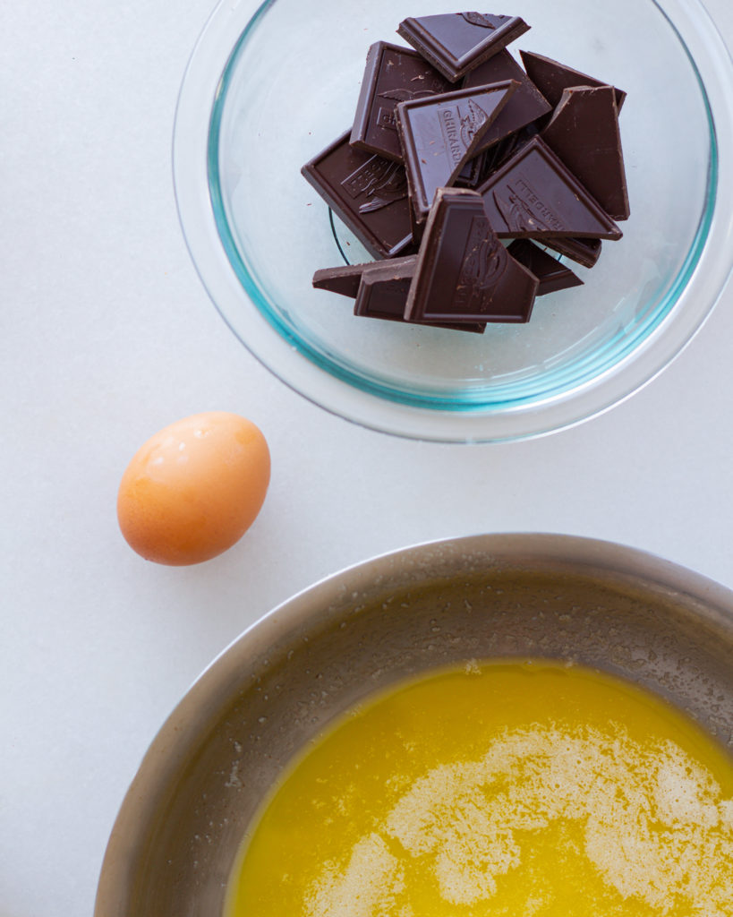 - Add one of the 113 gram chocolate bars to a bowl or cup and pour over the browned butter. Stir until the chocolate is melted and a thick chocolate liquid has formed.