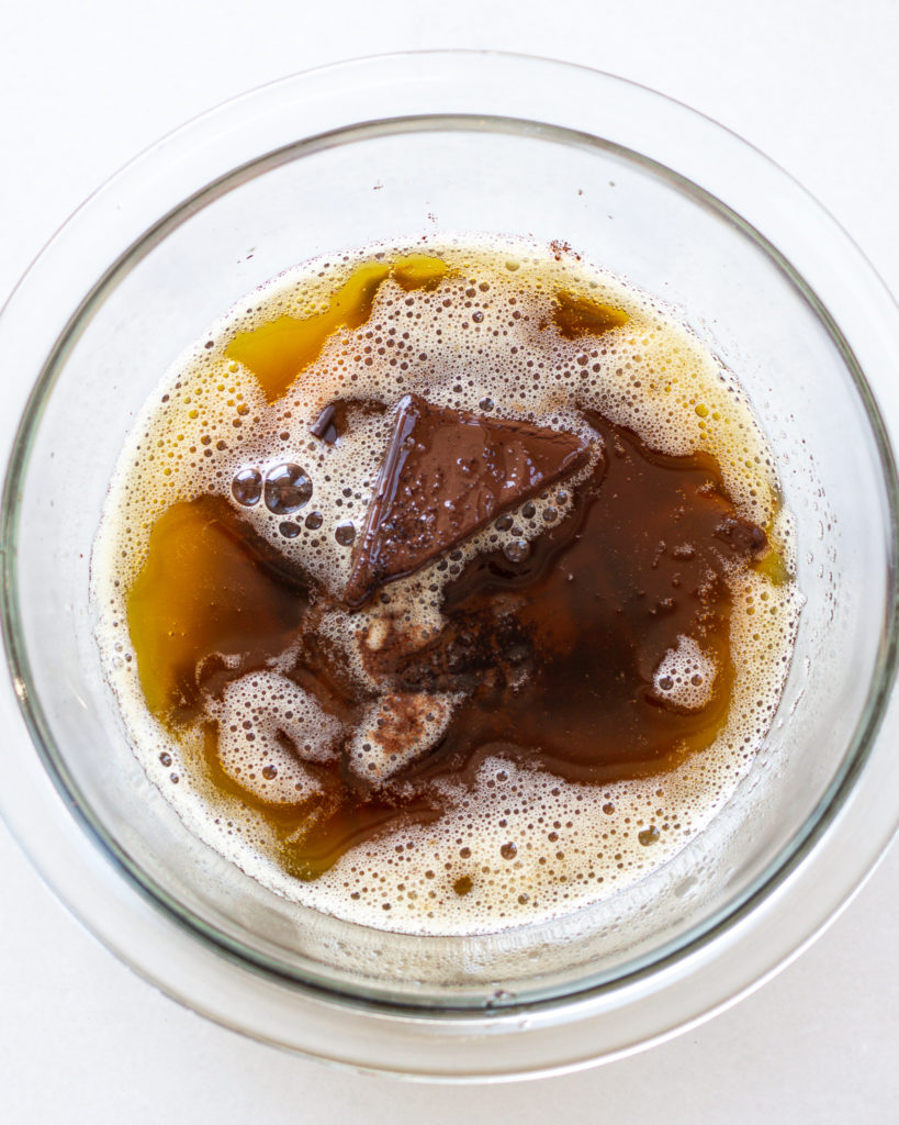 The chocolate dough is so important to this chocolate chocolate chip cookie recipe. It’s what gives it a deep fudgey flavor that you’d still have even without any chocolate chunks added. So first we start by browning butter and then adding it into the chocolate to melt.