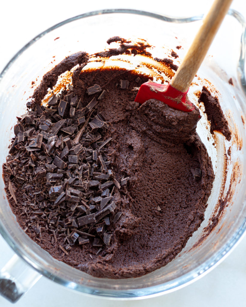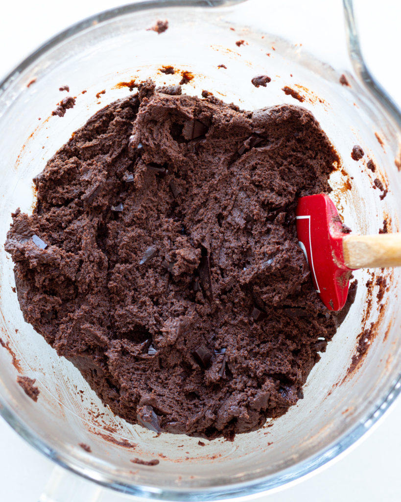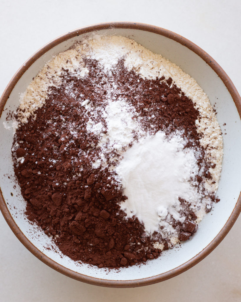 A trick here is to sift your dry ingredients if you see any lumps and clumps. Dutch process cocoa powder has a tendency to clump up, and you don’t want to find any pockets of dry cocoa powder when you mix your dough, so sifting is the best way to mitigate that.