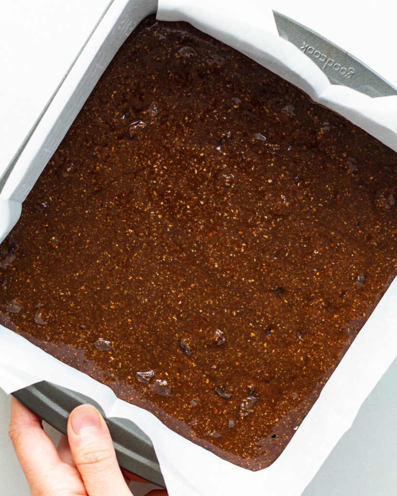- In a parchment lined 8×8 baking sheet, add the batter and smooth it out evenly.