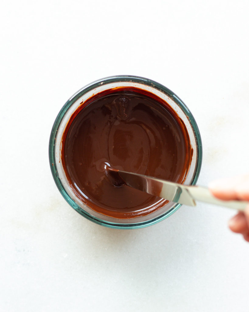 - In a small bowl or measuring cup, melt 1/4 cup of dark chocolate until smooth. I do this in the microwave using 30 second increments and stirring each time.