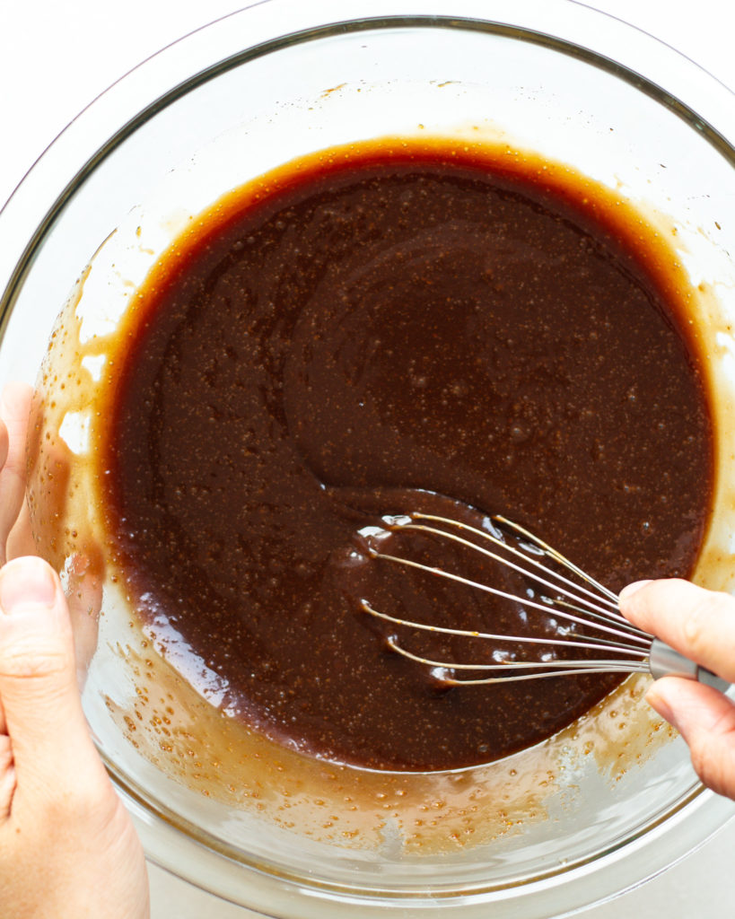 - In a large bowl, whisk together the eggs, vanilla extract, coconut sugar and brown sugar. Add in the olive oil+dark chocolate mix and whisk until well combined. Set aside