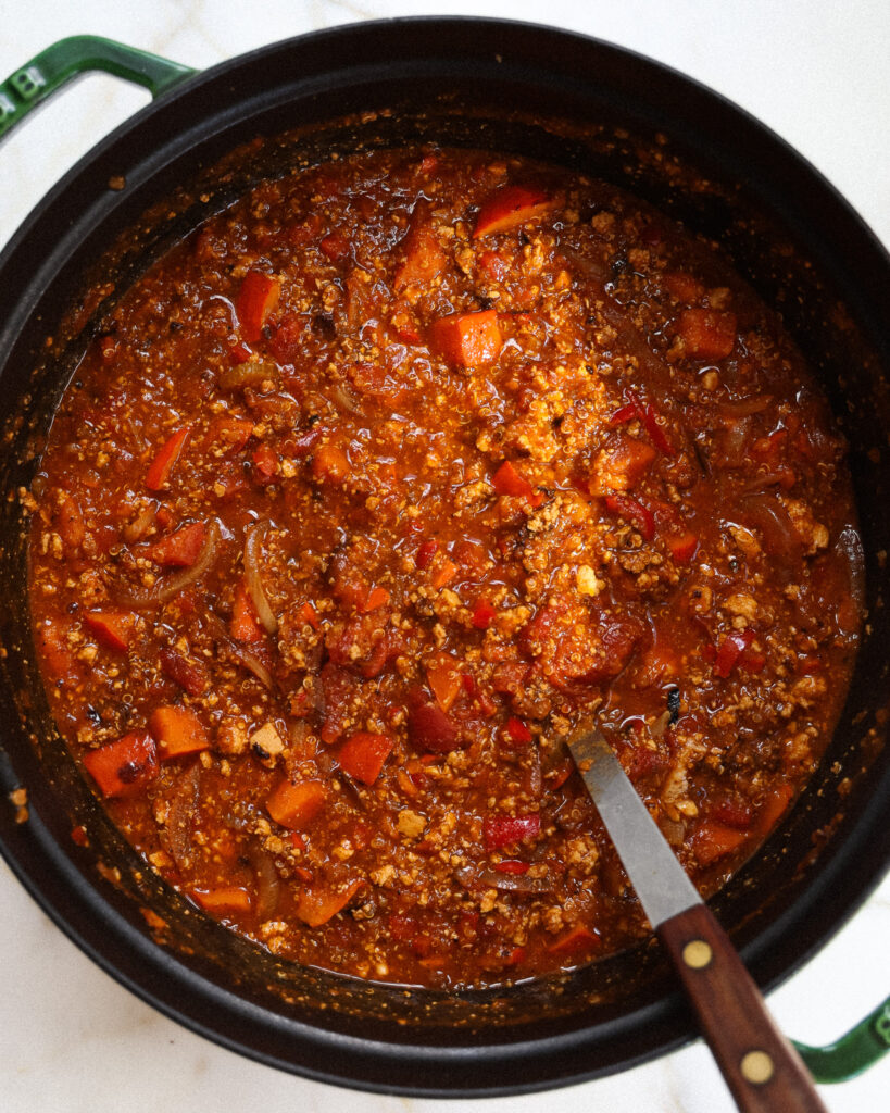 The recipe makes so much chili and we had it throughout the week. Did not get tired of it at all. Genuinely the best vegetarian chili I’ve ever had, the tofu+quinoa felt so meaty. Will make again for sure!!!