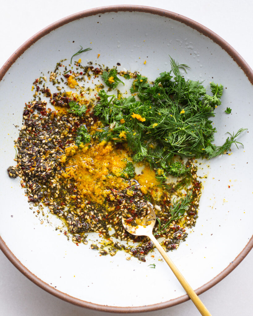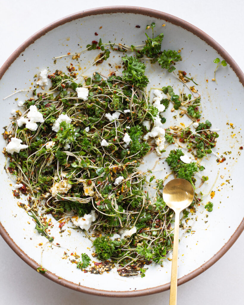 8. In a large bowl, whisk together 1 tablespoon of za'atar, 1/2 teaspoon of Aleppo pepper flakes, 1 tablespoon extra-virgin olive oil and kosher salt. Add in 2 tablespoons of parsley, 1 tablespoon of dill, 2 teaspoons of orange zest, and the zest and juice from 1 lemon. Toss to combine, taste and season with more salt as needed. Add in 1/2 pint of alfalfa sprouts and crumble in 2 tablespoons of ricotta salata. Toss to combine.