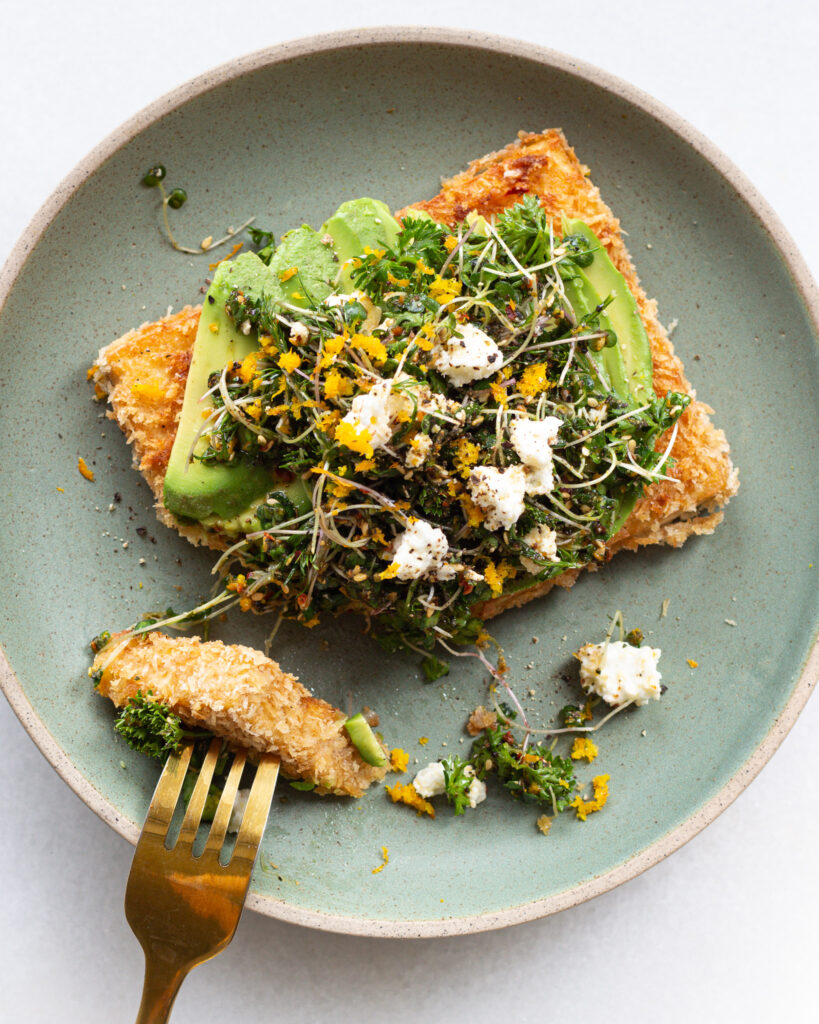 10. To assemble, add a generous amount of avocado slices to the top of each cutlet, then pile the sprout salad on top. It should be crunchy, creamy and zippy. All of my favorite things.