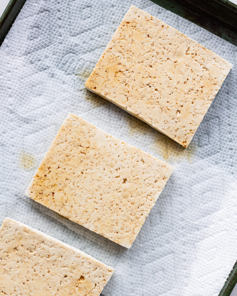 1. Drain the block of tofu and cut it lengthwise into 3 large rectangular pieces. Line a baking sheet with paper towels and lay the tofu flat on them. Cover with a few more sheets of paper towels and place another sheet pan on top. Weigh this down with a few books and press out any excess moisture for 10-15 minutes, but no longer than that.