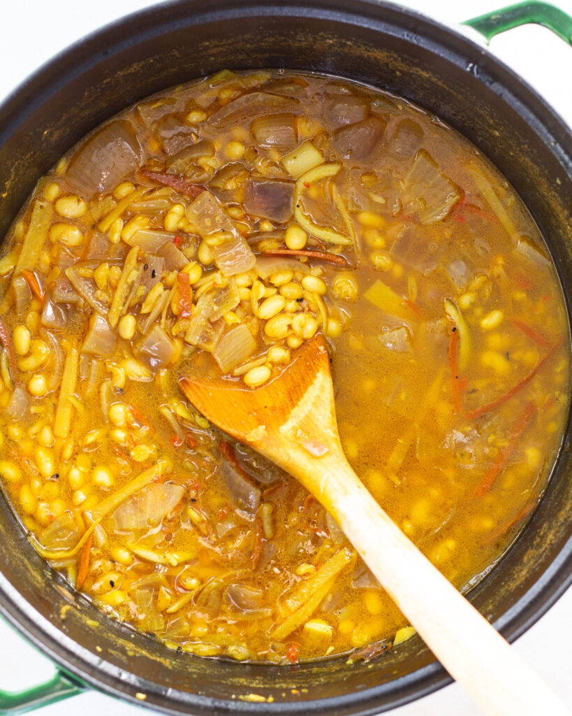 - Add in the beans and stir to coat them in the vegetables, they should take on the yellow turmeric hue rather quickly. Season with a big pinch of salt and then add the vegetable stock and the water.