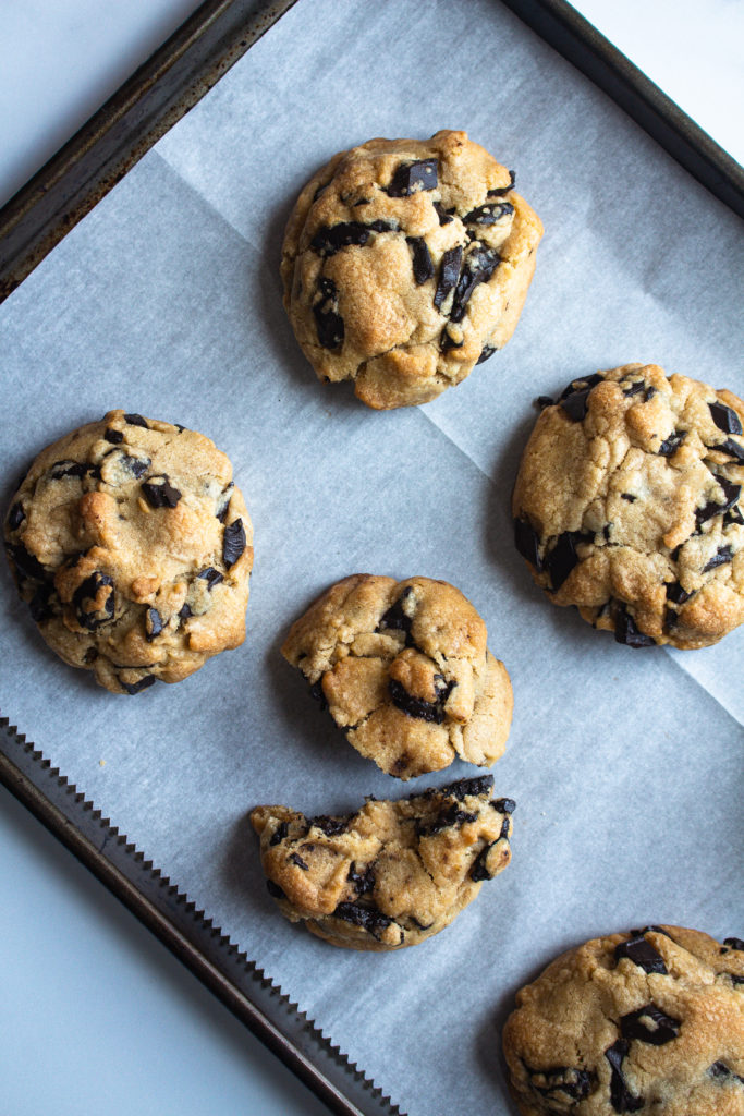 This is because of a few factors – vegetable shortening has a higher melt point than butter, meaning that it needs to be in the oven longer before it gets to that spread point that butter has. You know when you put a tall cookie dough mound in the oven and you check back and it’s a puddle? That almost never happens when using vegetable shortening. The shortening helps the cookies maintain their height while they bake throughout, making a moist, gooey, tall and tender cookie. Just like the ones at Levain!