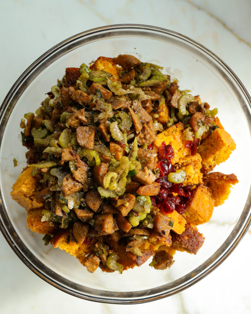 - In the bowl with the herbs and nuts, add the dried cornbread cubes, the cooked vegetables and sausage, the drained cranberries, and the egg mixture. Stir gently to just combine. The cornbread may start to crumble in this step, don't worry about it, but don't overmix it until it is mush. Try to gently get everything combined.