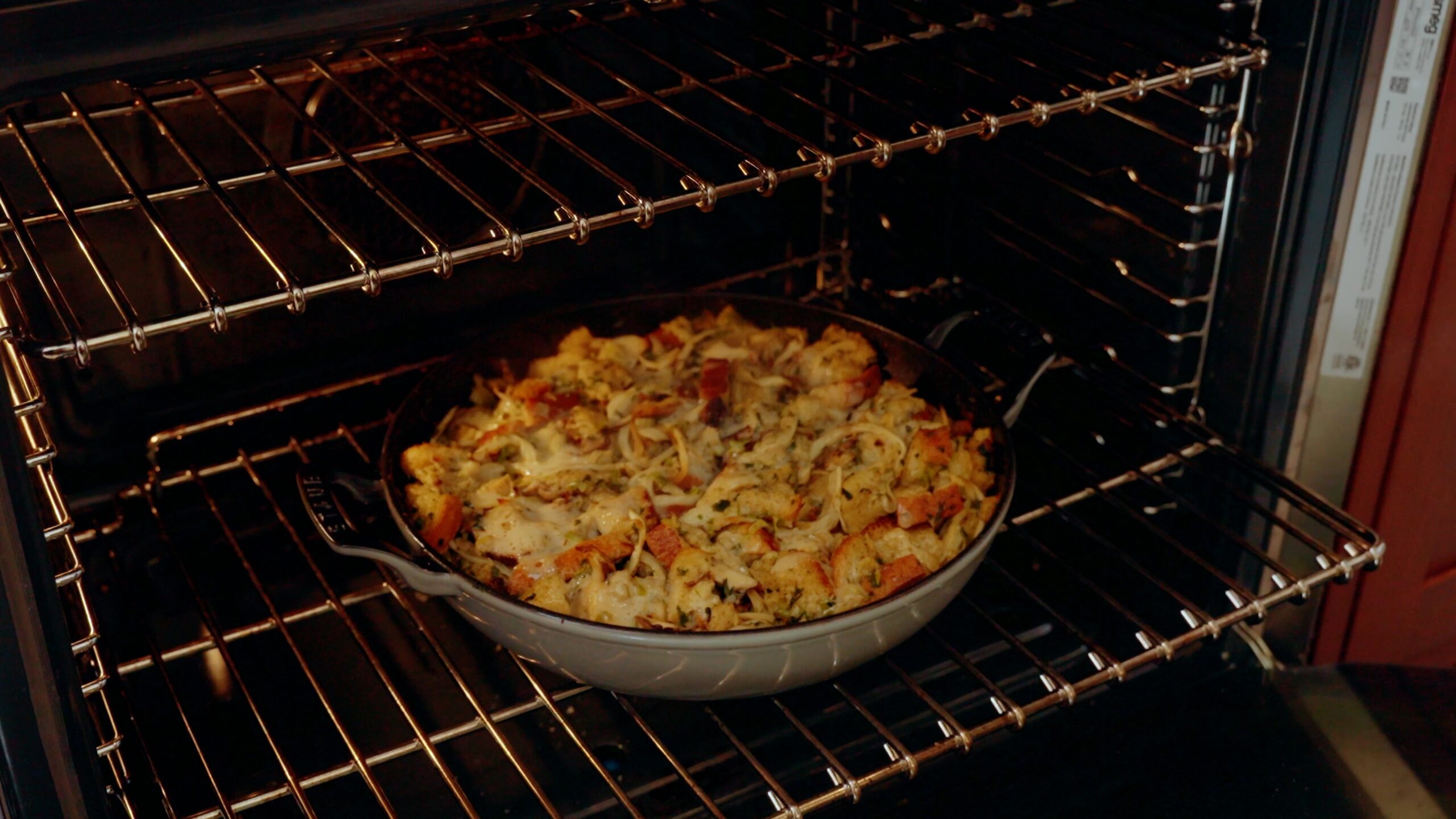 - Third, heavy cream takes the place of broth, giving you richness and crispness. Heavy cream caramelizes in the oven, so unlike broth (which to me just makes things overly salty, especially in a stuffing that already has a meat component), the heavy cream just adds a subtle richness and a deliciously golden color.