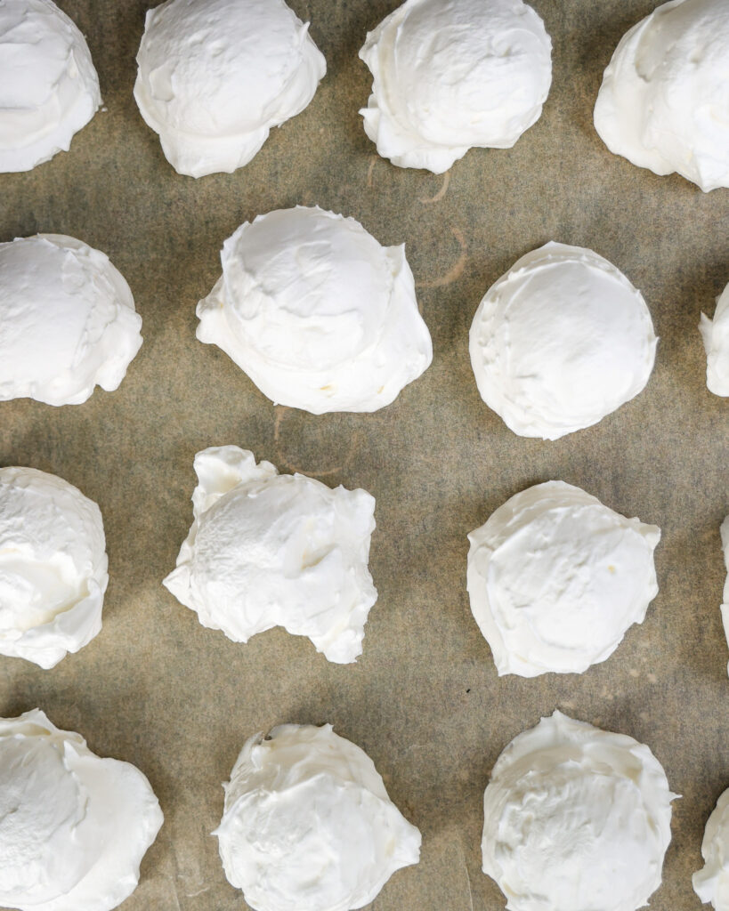 Use a 3 tablespoon cookie scoop to scoop the marshmallows onto the sheet pan. It will make around 20.