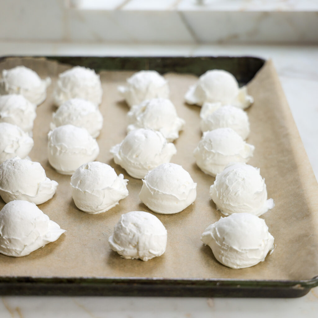 - Line a half sheet pan with parchment paper. Use a 3 tablespoon cookie scoop to scoop the marshmallows onto the sheet pan. It will make around 20.
