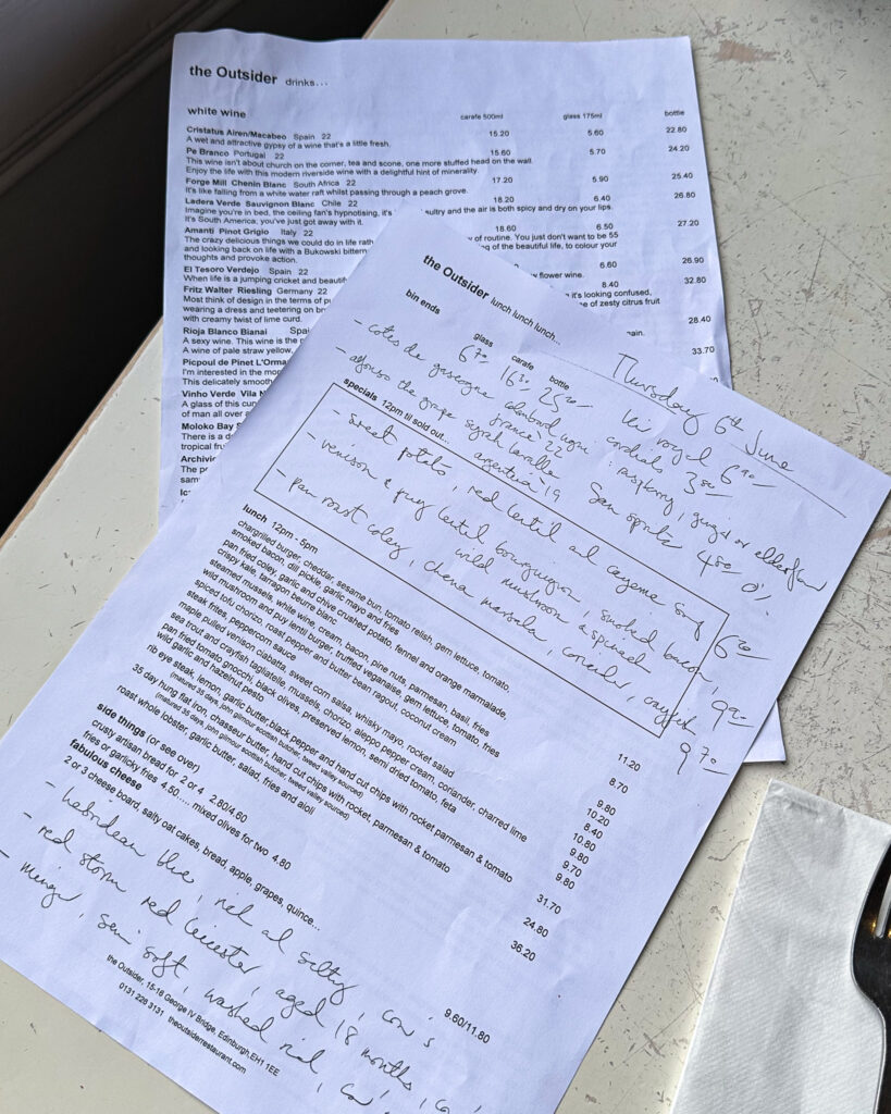 The Outsider – you know how much I love a handwritten menu and a cheeky wine list. This place has stunner views of the Edinburgh Castle, so it fills up with tourists and locals alike. They only take bookings by phone, but I highly, highly recommend a reservation.
