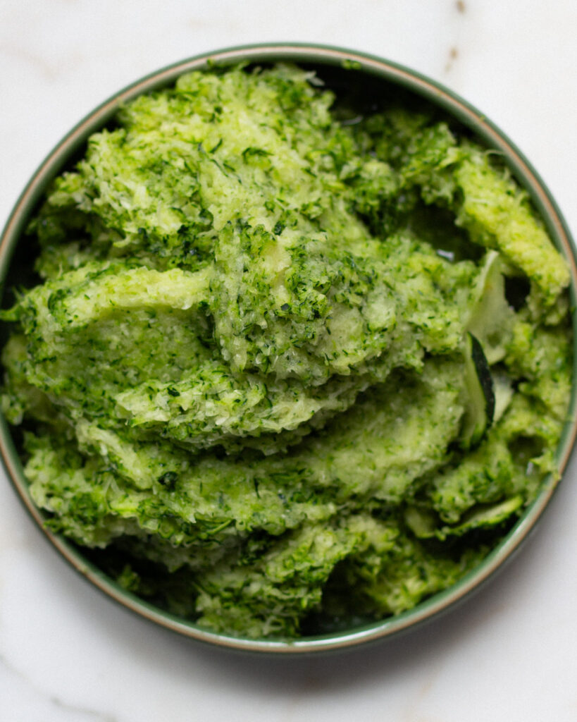 For this recipe, you’ll want to grate the zucchini as finely as possible (see reference photo above). Grate it into a bowl, and be sure not to drain it. Its moisture is good for this recipe!